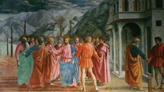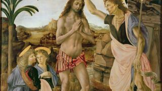 ヴェロッキオ《キリストの洗礼》をやさしく解説。レオナルド・ダ・ヴィンチが描いた天使と背景、ヨルダン川での洗礼場面、フィレンツェ工房の師弟関係まで、ウフィツィ美術館の名画を丁寧に紹介します。