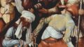 右手にはゴシック様式の教会、左手には都市の建設現場のようなモチーフが見えます。聖史の舞台を遠い昔に押しやるのではなく、画家と同時代の街並みに据える――北方宗教画の常套ですが、ここでは特に効果的です。
