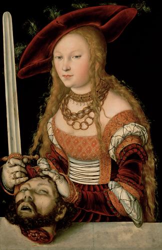 クラナハの《ユーディト》では、細いウエストのドレスをまとった若い女性が、片手に大きな剣、もう一方の手で切り落とされた男の首を持っています。