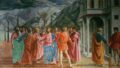 連作:同じ礼拝堂の聖ペテロ伝フレスコ群の一部で、入口付近の対向面にはマゾリーノによる《楽園の誘惑》が描かれている