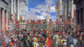 イエスは光輪と強い逆光で際立っていますが、構図としてはあくまで群衆の中の一人として描かれています。
