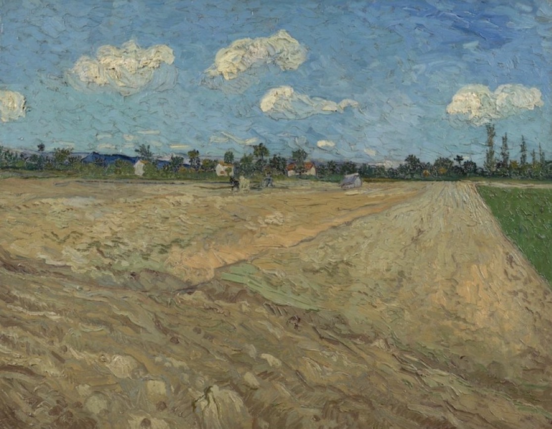 ヴィンセント・ファン・ゴッホは、刈り取りを終えた畑に鋤の跡が走る光景に出会い、土そのものを主役に据えた一枚を仕上げました。